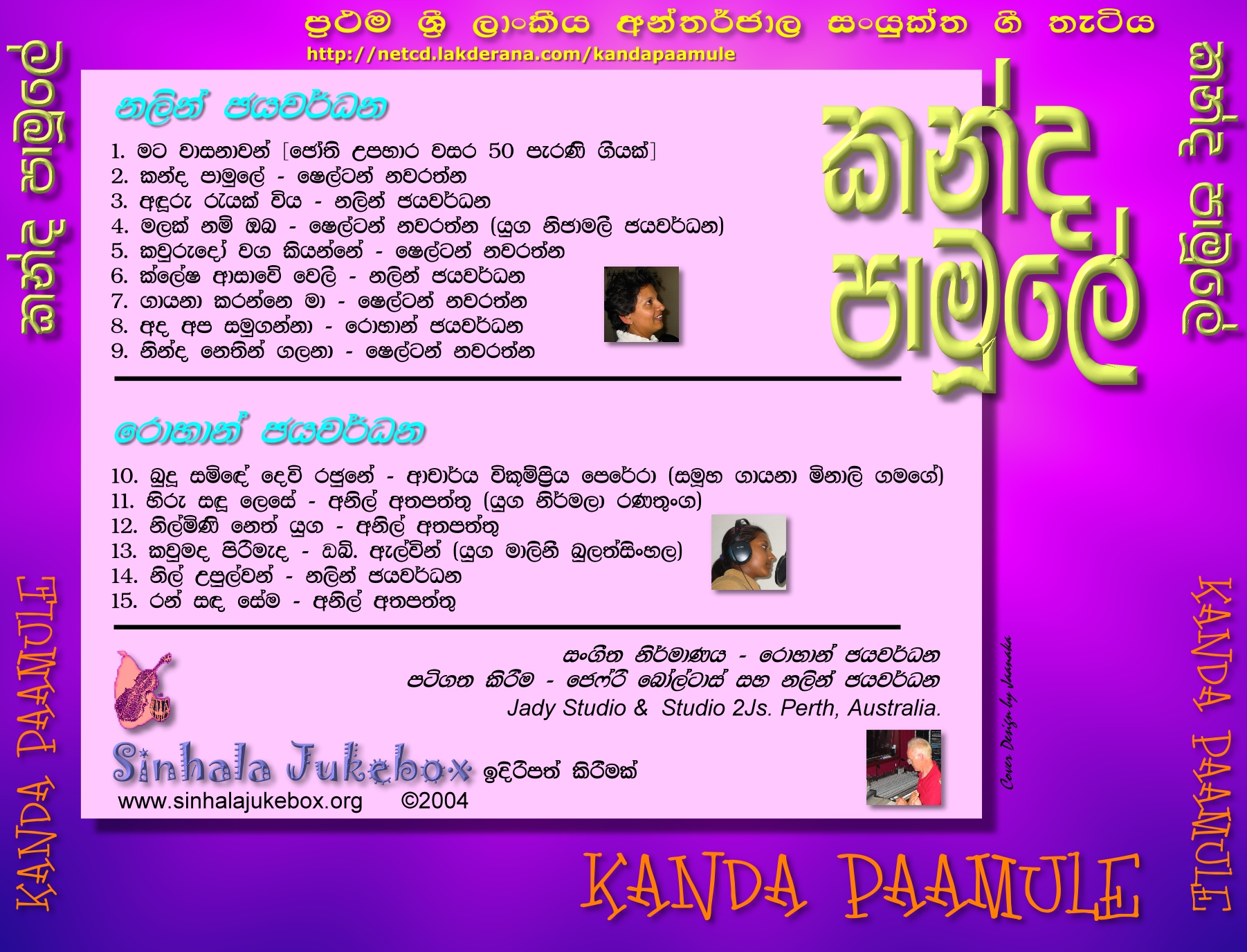 Kandapaamule is a collection of tracks recorded over years by two brothers Rohan and Nalin Jayawardena who currently reside in Australia. The Music direction and composition of all the songs were done by Rohan Jayawardena. He is an accomplished Sri Lankan music director and currently resides in Australia. Vocals are by Nalin and Rohan Jayawardena. Lyrics by W. Alwin, Anil Attapattu, Shelton Nawaratne, and Dr. Vicumpriya Perera. Duet vocals are by Malini Bulathsinhala, Nirmala Ranathunga, Nijamali