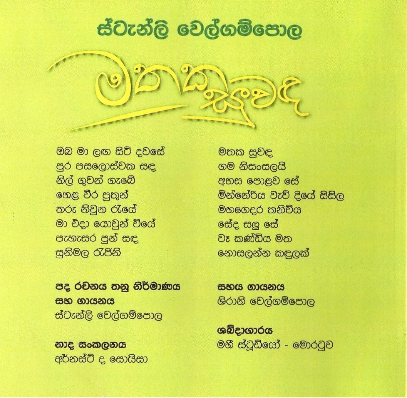Stanley Welgampola is a writer as well as a musician. He recently published a collection of his English short stories and Sinhala poems in his book titled, Some call it Destiny. Over the years Stanley has composed lyrics to several songs, which were sung and recorded by another Artist. With his most recent creative work, Stanley decided to voice his own songs and record the album “Mathaka Suwanda”. Having joined the Church choir at the age of eight and following in the footsteps of his late father, playwright and musician Malachias Perera of Negombo, Stanley has a great and enduring love for music. His appreciation for the rural life in Sri Lanka and the beauty of the countryside are depicted in many of his songs. Stanley is now retired from the Pharmaceuticals industry and is currently lecturing in a Teacher Training School in Colombo . He blends both fact and fiction into his compositions and finds inspiration through his strong beliefs, his adoring students and his own life experiences. He is joined by his wife Shirani on vocals for the duets on this album. We are featuring 08 songs from of his album "Mathaka Suwandha" in NetCD. If you like to purchase the full CD and or send feedback to Stanley, please email him at swelgampola"at"yahoo.com. He welcomes all feedback from you, so please take a minute and send him your thoughts.