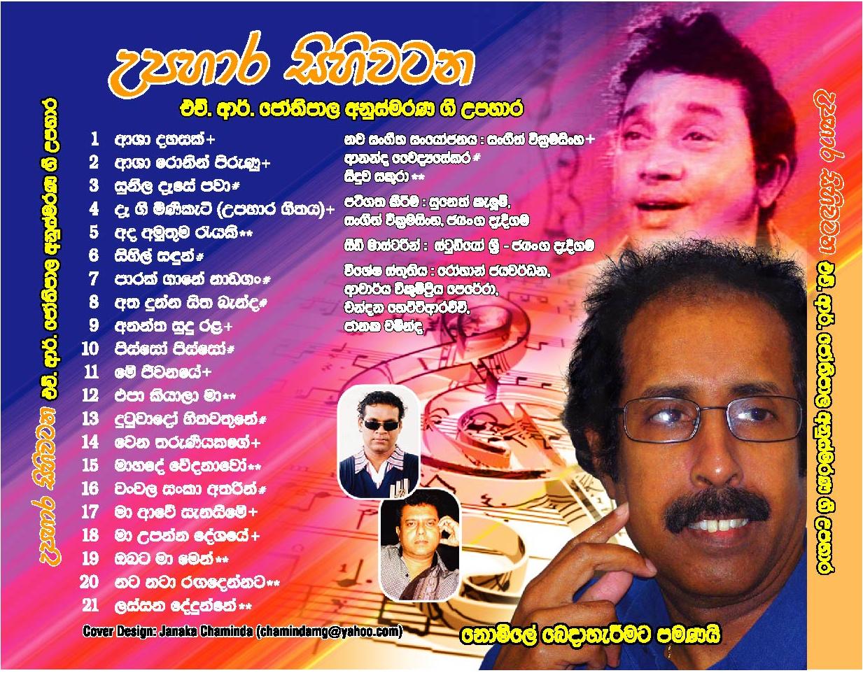 Upahara Sihiwata is a tribute CD for the legendary Sri Lankan pop artist H R Jothipala who died more than 22 years ago. The CD featuring here contains 20 all time clasics re-sung by Nalin Jayawardena. These 20 songs were sung by H R Jothipala under the music direction of legendary Sri Lankan musicians such as Premasiri Khemadasa, Sarath Dasanayake, M K Roksamy, Shelton Premaratne and Melroy Dharmaratne. Lyrics of these songs are by Karunaratne Abeysekera, Premakeerthi De Alwis, and Kularatne Ariyawansa. Current CD contains new music direction by Sangeeth Wickmarasinghe, Ananda Waidyasekera, and Seeduwa Sakura. It also includes a Tribute song to H R Jothipala to a theme of a popular song by him written by Vicumpriya Perera and music drected by Sangeeth Wickramasinghe. This special NETCD edition contains 03 BONUS tracks by Nalin Jayawardena of 03 additional popular songs of H R Jothipala.