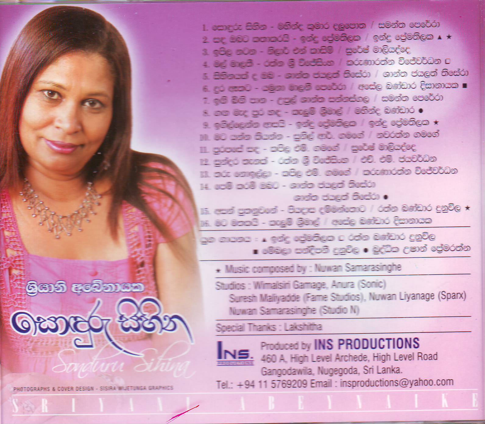 Sonduru Sihina is the debut compact disc containing 16 songs by Sriyani Abeynayake. The CD is produced by INS Productions of Nuhgegoda, Sri Lanka. The music compositions for the albums are by H M Jayawardena, Karunaratne Wijewardena, Samantha Perera, Suresh Maaliyadde, Navaratne Gamage, Mahinda Bandara, Shantha Jayalath Thisera, Indu Premathilaka, Asela Bandara Disanayake, and Rathna Bandara Dunuwila. Lyrics are by Mahinda Kumara Dalupotha, Indu Premathilaka, Nilar N Cassim, Rathna Sri Wijesinghe, Shantha Jayalath Thisera, Yamuna Malini Perera, Upul Shantha Sannasgala, Kelum Srimaal, Sunil R Gamage, Kalipa M Gamage, and Piyadasa Dammantota. Recording and CD Mastering is by Sonic, Fame Studio, Sprax, and studio N. Photos and CD cover design is by Sisira Wijetunga.