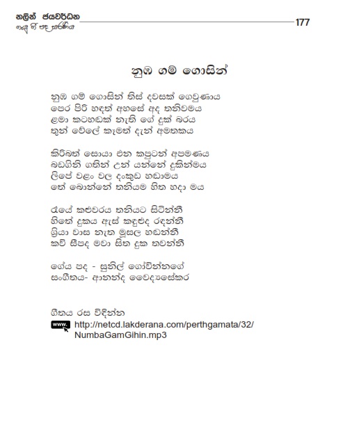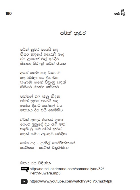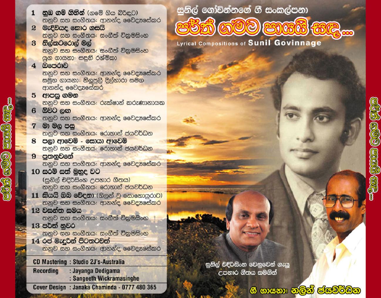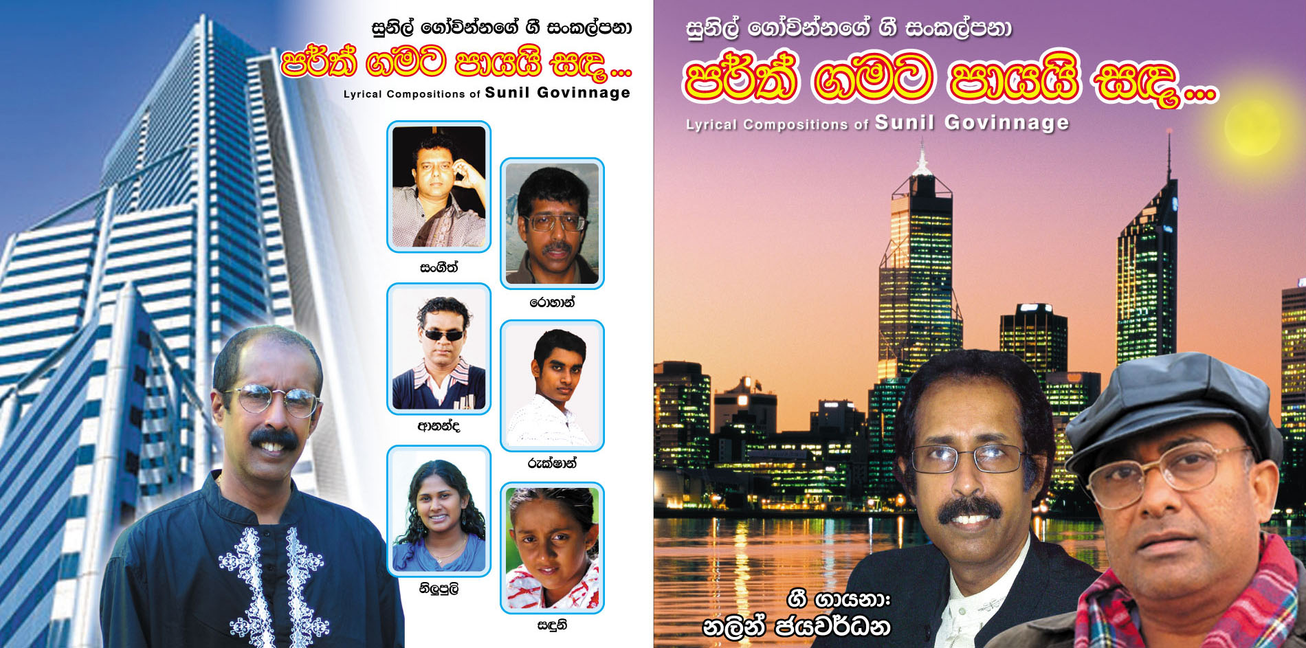 Perth Gamata Paayayi Sandha is the debut compact disc containing 14 songs written by Sunil Govinnage. The CD is produced in Australia where Sunil is residing now. All songs in the album are voiced by Nalin Jayawardena with duets by Sanduni Rashmika, Nilupuli Dilhara, and Ananda Waidyasekera. The music compositions for the albums are by Rohan Jayawardena, Ananda Waidyasekera, Sangeeth Wickramasinghe, and Rukshan Karunanayake. CD mastering is by Studio 2J of Australia and recording are by Jayanga Dedigama and Sangeeth Wickramasinghe. Cover design of the CD is by Janaka Chaminda. The CD contains a tribute song to Sunil Edirisinghe, a veteran classical vocalist of Sri Lanka.