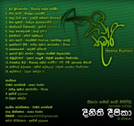 Heena Kumari is an album of 15 lyrical compositions of Dinithi Deepika, originally from Horana and currently living and working in Cyprus as a Nurse. The songs in the album are sung by Chandana Liyanarachchi, Visharada Nalina Kasmira, Udeni Pabasaraa Liyanage, Majula Udayasiri, Kapila Kumara Aparekka, Iresh Udayanga, Anju Praneeth, Ajith Premalal, Pahansilu Chaturanga, Kokila Gayathri, Sandhasiri Adikari, Niluka Jayamini Tilakaratne, Thushara Kelum, Thilini Sowmya Wijeratne, H M Subhagya Geethani, and Dhanuka Amalsha. Tunes are composed by Chamara Hagangama, Kapila Kumara Aparekka, Iresh Udayanga, and Danuka Amalsha. Music direction by Chamara Hapangama and Recording by Yaha Audio. Contact heenakumari1010 at gmail.com for comments.