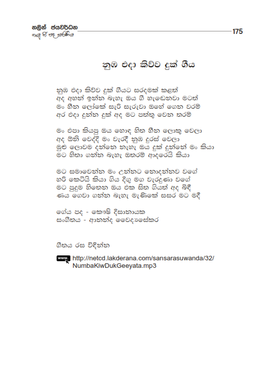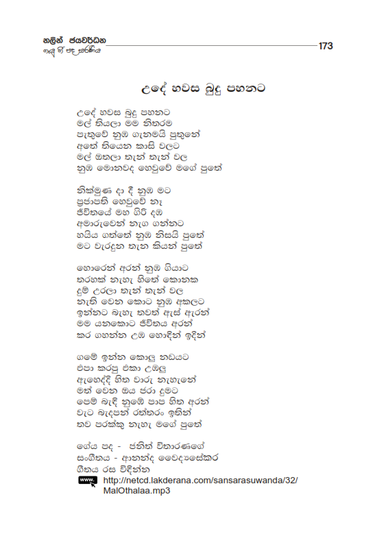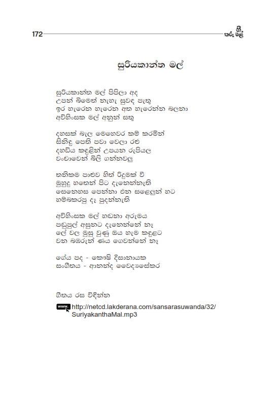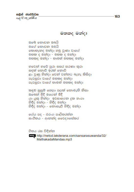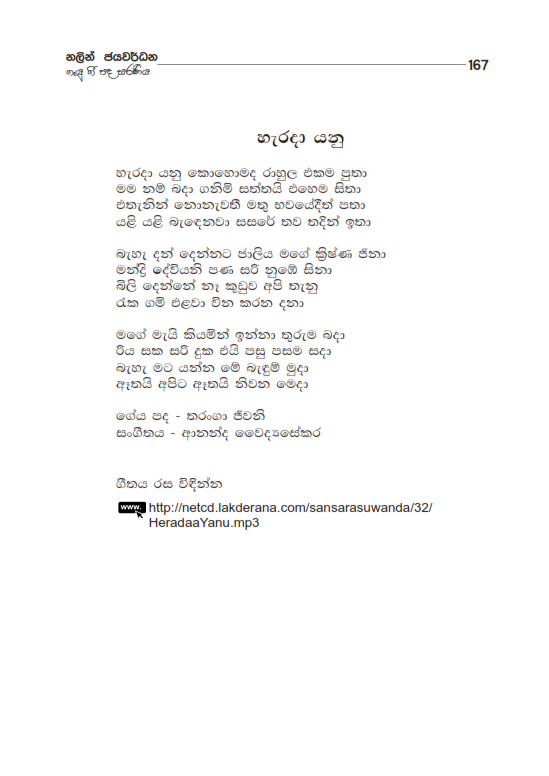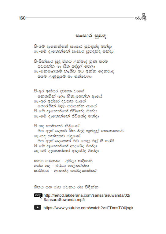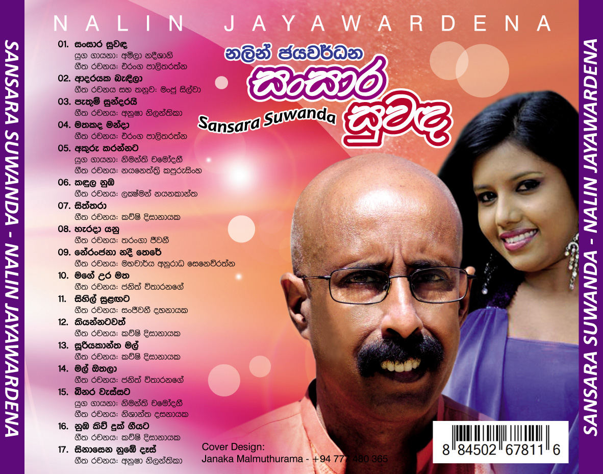 Sansara Suwanda is the newest sinhala song album by Nalin Jayawardena released on March 2015 under the Lanka Heritage Label, Sansara Suwanda contains seventeen (16) songs whose tunes are composed by Ananda Waidyasekera and one (01) song tune composed by Maju Silva. Album contains one (01) duet with talented vocalist Amila Nadeeshani and two (02) duets with the upcoming talented vocalist from Sri Lanka, Nimanthi Chamodini. Lyrical compositions of the album are by Anusha Nilanthika, Eranga C. Palathiratne, Manju Silva, Nayanethiri Kapurusinghe, Lakshman Nanayakantha, Kawshi Disanayake, Tharanga Jeevani, Prof. Anuradha Seneviratne, Janith Vitharanage, Nishantha Dasanayake, and Sanjivani Dahanayake. CD cover is by Janaka Malmuthurama and CD music direction is by Ananda Waidyasekera.