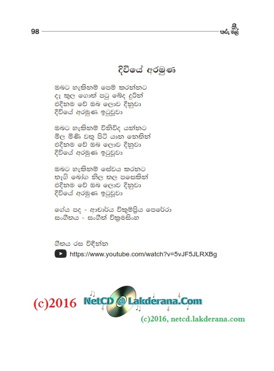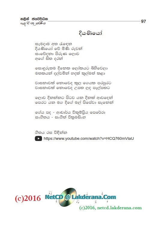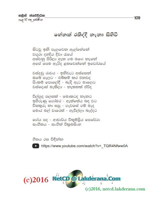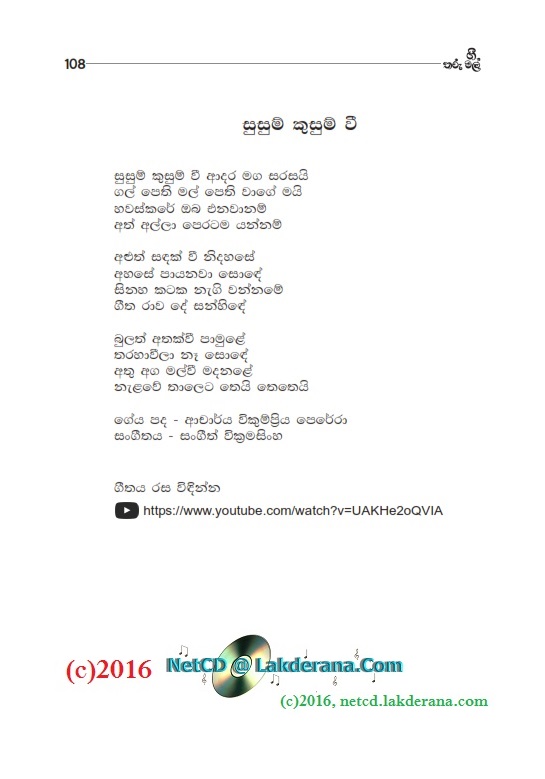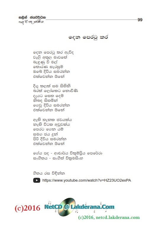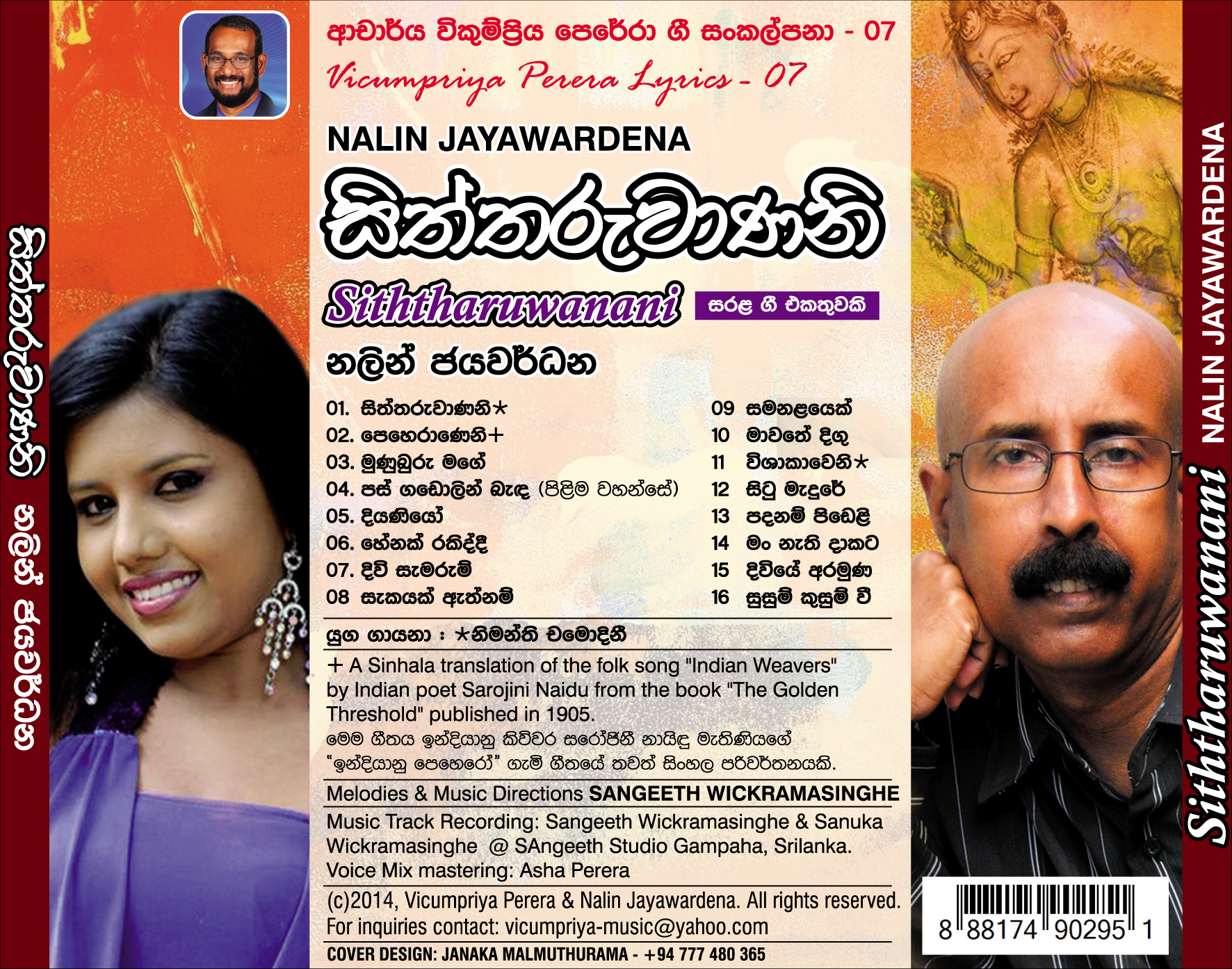 This is the seventh lyrical composition album of Vicumpriya Perera. All songs included on this album are sung by Nalin Jayawardena, a Sri Lankan born versatile vocalist residing in Perth, Australia. Music composition and music direction for the album is by the talented music composer and director Sangeeth Wickramaisnghe. This album features two duets with Nimanthi Chamodini who is a talented Sri Lankan reality musical show star. Music orchestra for the album consists of renowned Sri Lankan musicians Mahendra Pasquel, Sarath Fernando, Dhananjaya Somasiri, Janaka Bogoda, Susil Amarasinghe, Rohana Dharmakeerthi, Shelton Wijesekera, and Dilusha Ravindranath. Album cover is by Janaka Chaminda and the CD production is by Lanka Heritage, LLC.