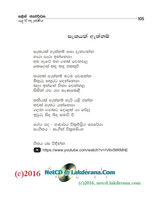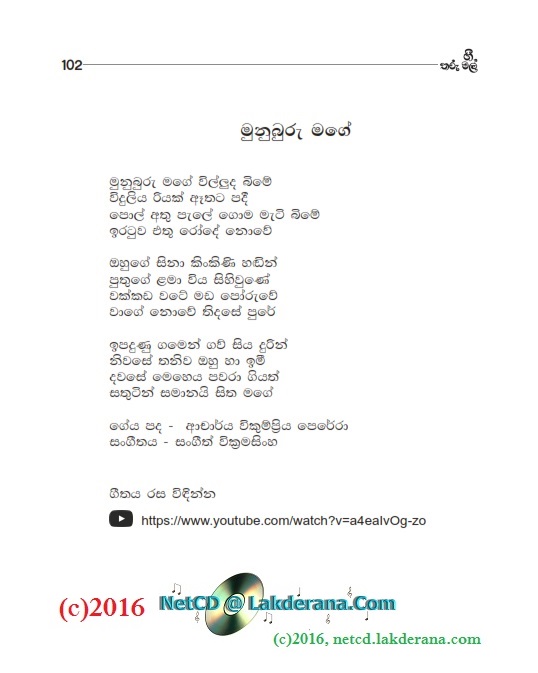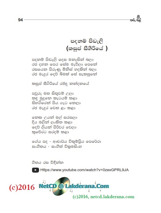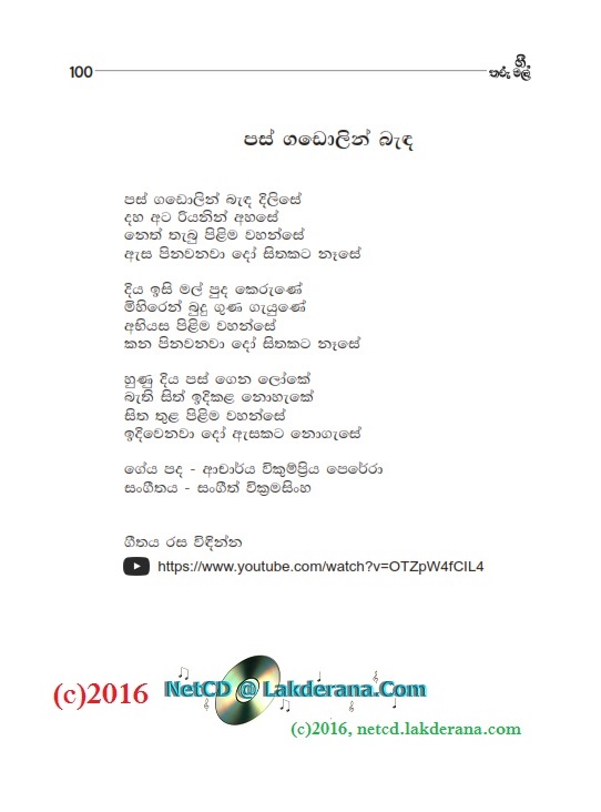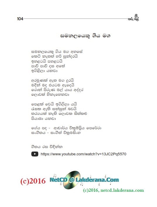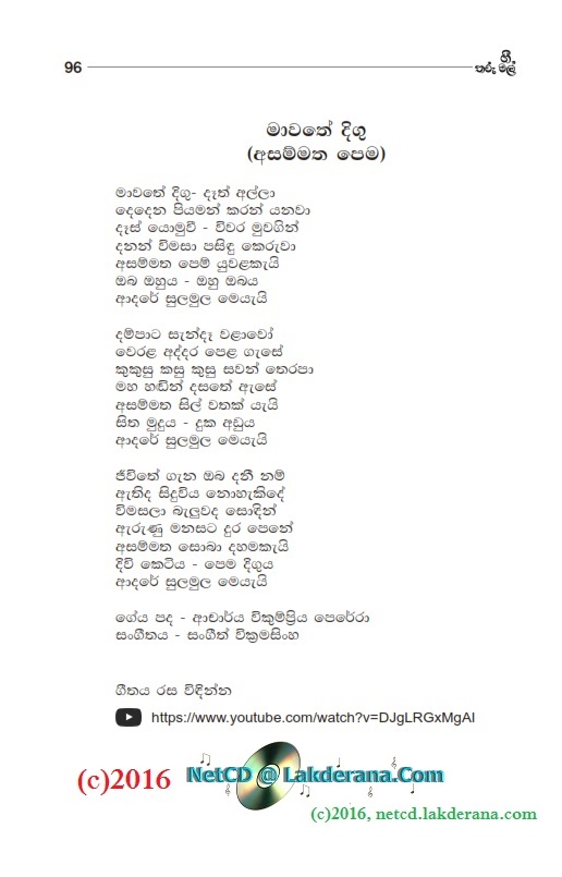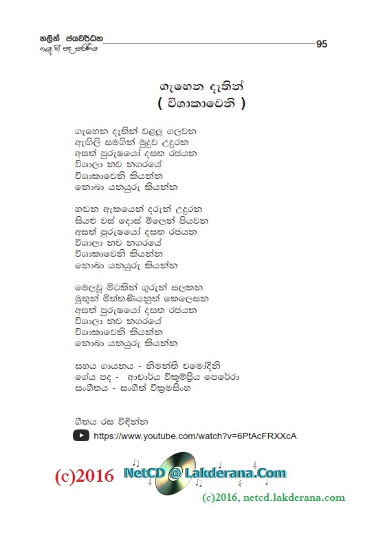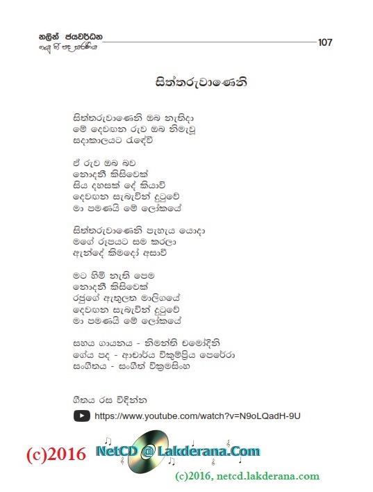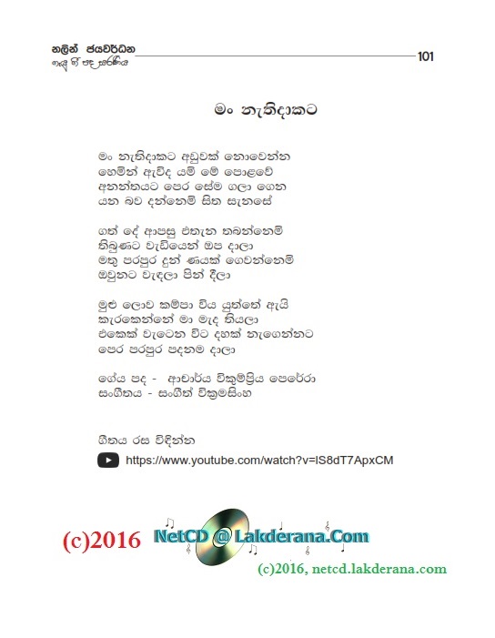 This is the seventh lyrical composition album of Vicumpriya Perera. All songs included on this album are sung by Nalin Jayawardena, a Sri Lankan born versatile vocalist residing in Perth, Australia. Music composition and music direction for the album is by the talented music composer and director Sangeeth Wickramaisnghe. This album features two duets with Nimanthi Chamodini who is a talented Sri Lankan reality musical show star. Music orchestra for the album consists of renowned Sri Lankan musicians Mahendra Pasquel, Sarath Fernando, Dhananjaya Somasiri, Janaka Bogoda, Susil Amarasinghe, Rohana Dharmakeerthi, Shelton Wijesekera, and Dilusha Ravindranath. Album cover is by Janaka Chaminda and the CD production is by Lanka Heritage, LLC.