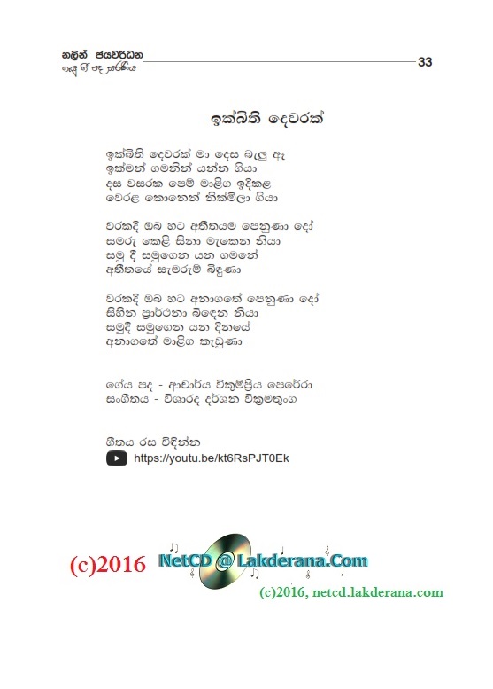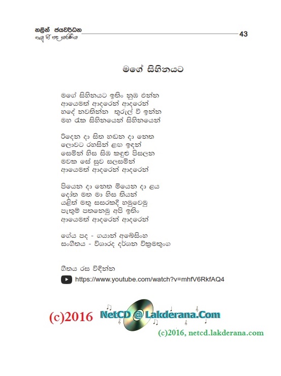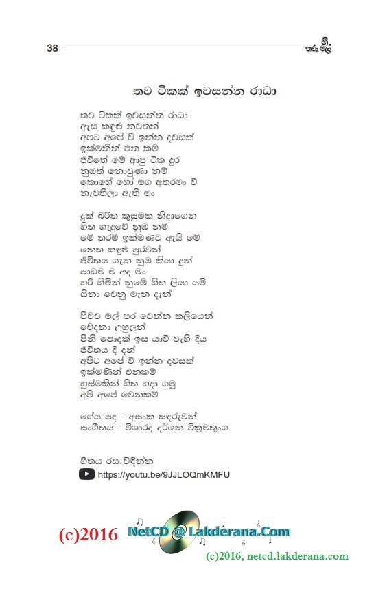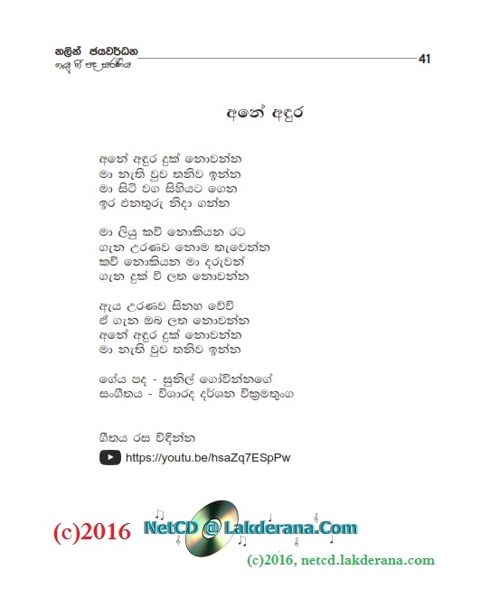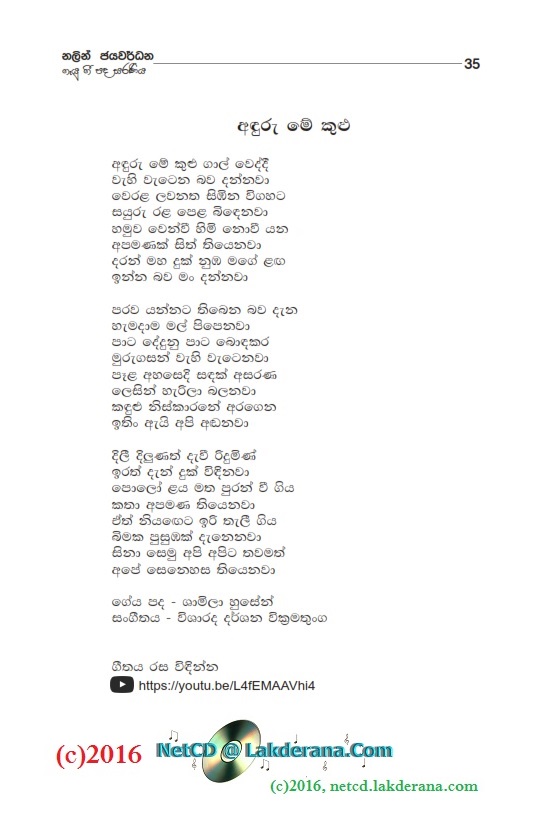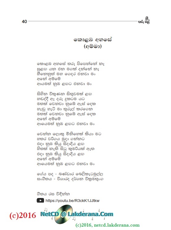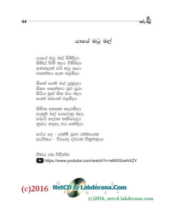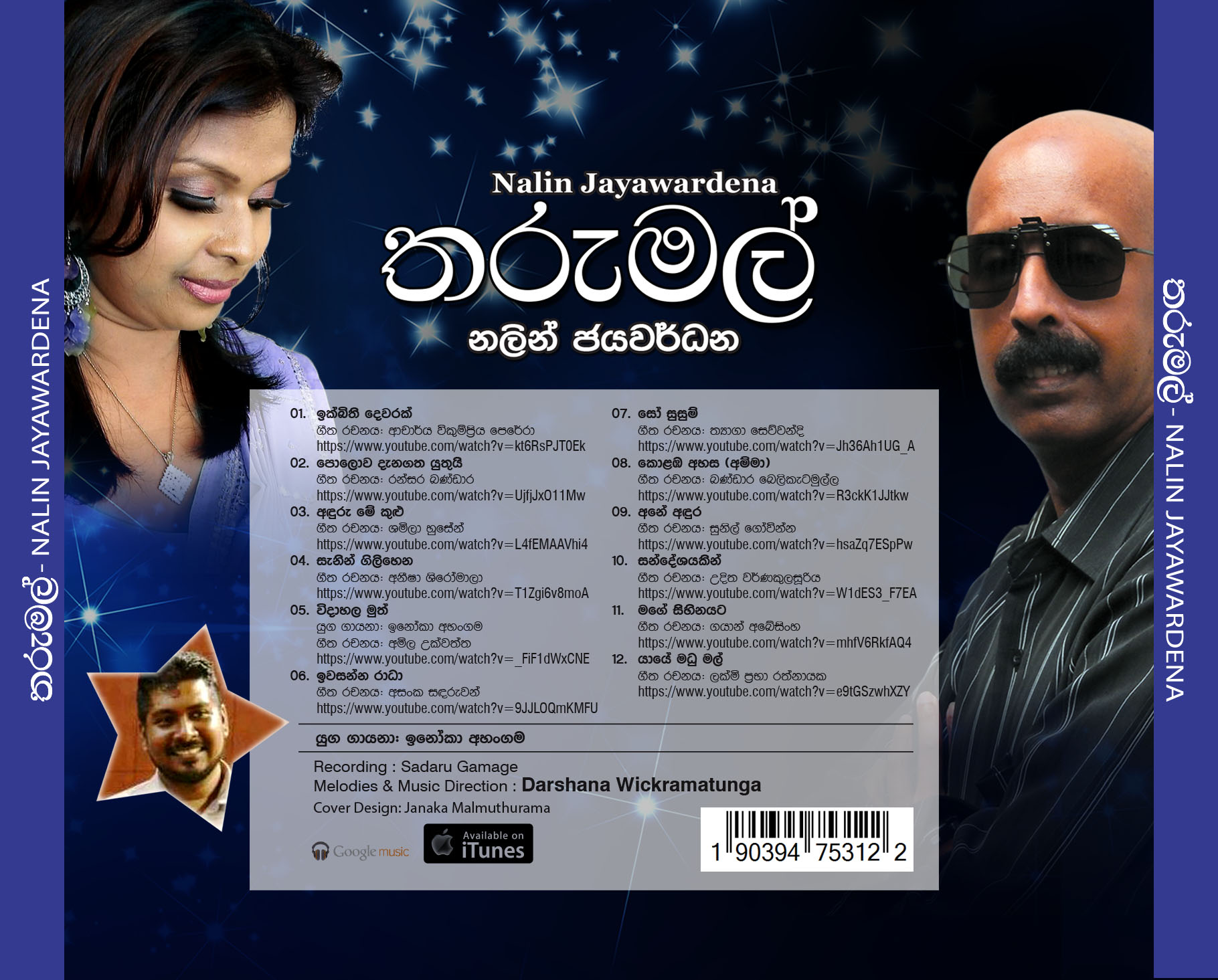Tharu Mal is the second album of Nalin Jayawardena Trilogy released in July 2016: Malata Muwarada, Tharu Mal, and Sepalika Mal. Music directions for all 12 songs of this album are done by Darshana Wickramathunga. Lyrics are written by Vicumpriya Perera, Ransara Bandara, Shamila Hussain, Aneesha Shiromaala, Amila Ukwatta, Asanka Sandaruwan, Thyaga Sewwandhi, Bandara Beliketamulla, Sunil Govinna, Uditha Warnakulasooriya, Gayan Abeysinghe, and Lakmi Prabha Ratnayake. Recording by Sadaru Gamage. Cover design is by Janaka Malmuthurama. A proud release of Lanka Heritage, LLC.