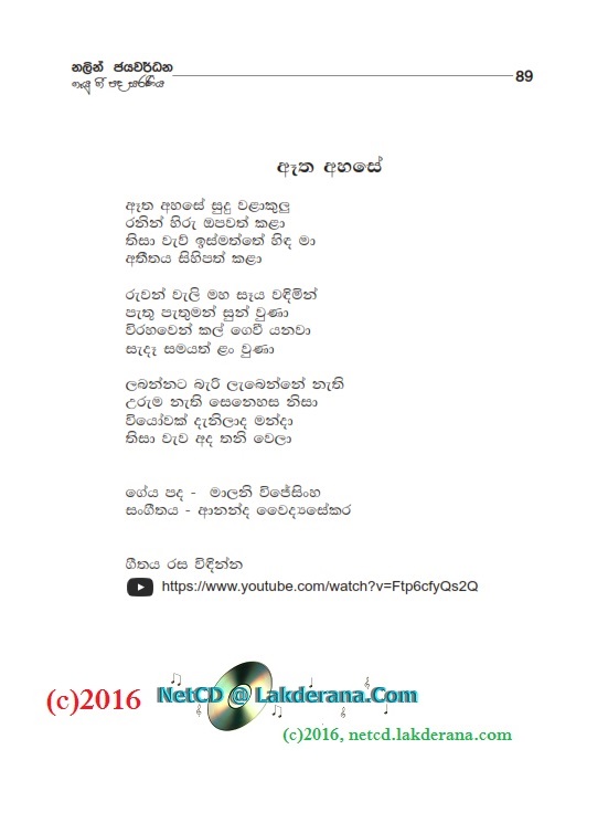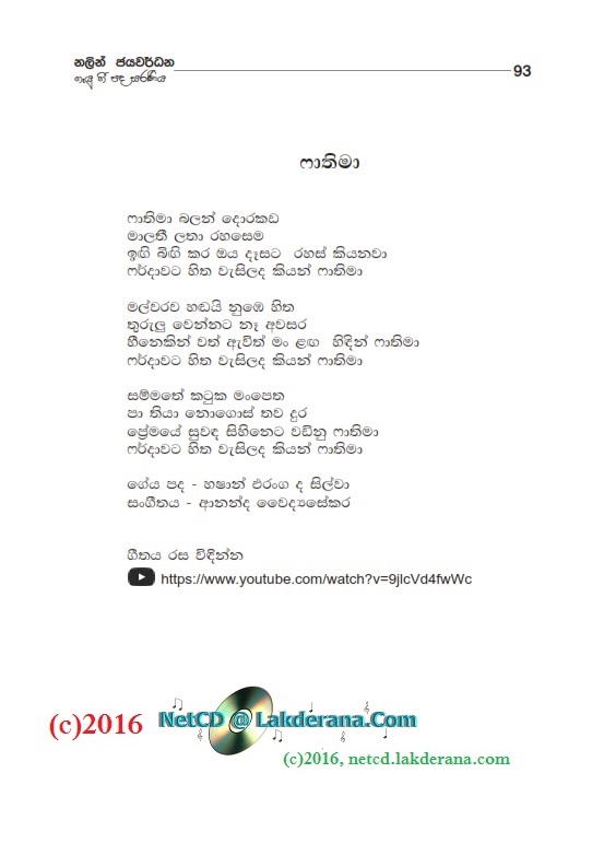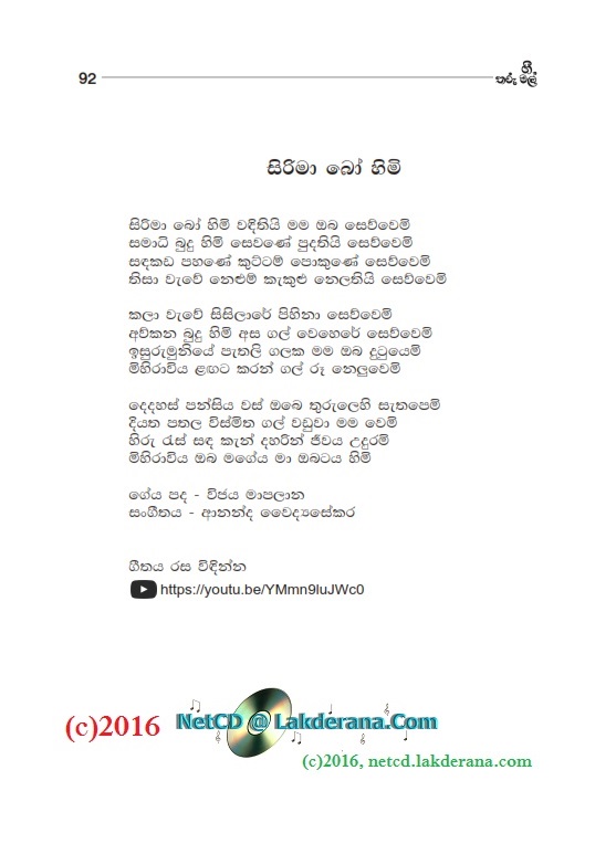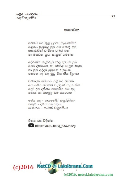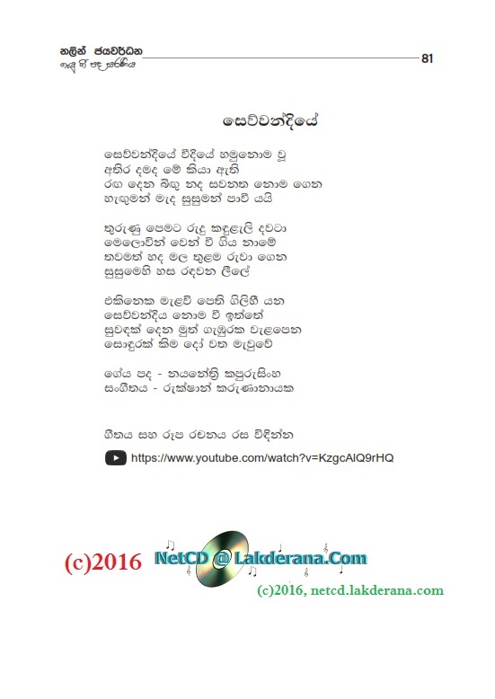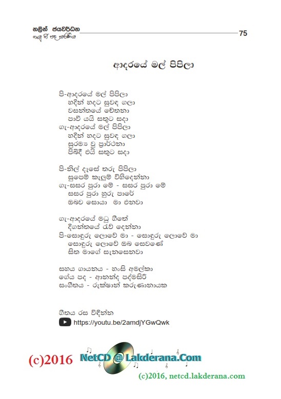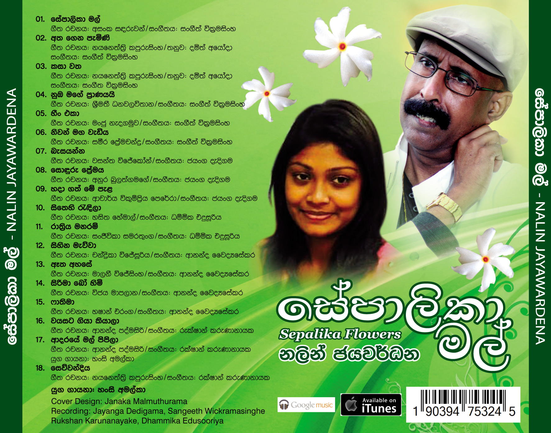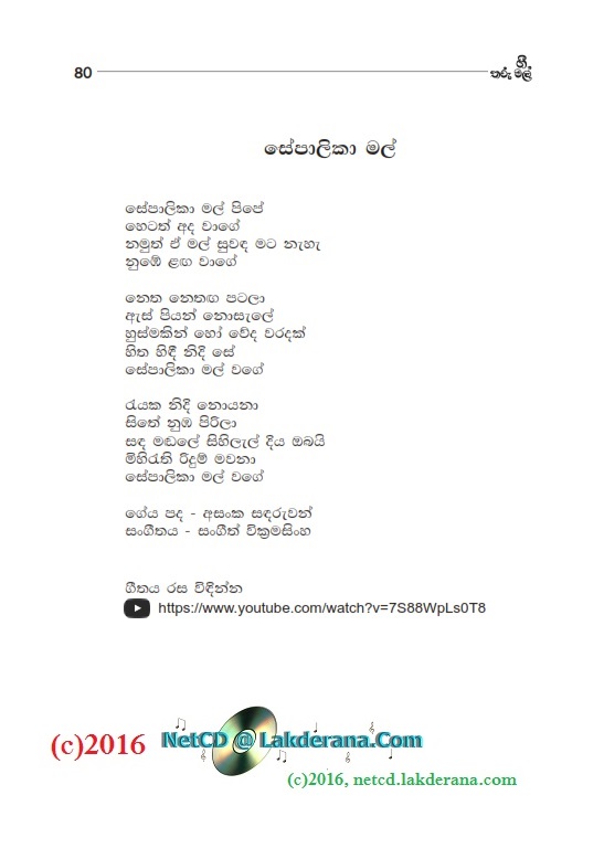 Sepalika Mal is the third album of Nalin Jayawardena Trilogy released in July 2016: Malata Muwarada, Tharu Mal, and Sepalika Mal. Music directed by Jayanga Dedigama, Sangeeth Wickramasinghe, Ananda Waidyasekera, Rukshan Karunanayake and Dhammika Edussoriya. Tunes for the two songs Atha Gena and Kasawatha are by Damith Ayodaya. Lyrics are written by Asanka Sandaruwan, Nayanethri Kapurusingha, Srimathi Danawalavithana, Manju Nadagamuwa, Sameera Premachandra, Wasantha Wijekoon, Anura Bulathgamage, Vicumpriya Perera, Hasitha Hemal, Sanjeevika Samarathunga, Chandrika Wijesooriya, Malini Wijesinghe, Vijaya Mapalana, Hashan Eranga, and Ananda Padmasiri. Cover design is by Janaka Malmuthurama. A proud release of Lanka Heritage, LLC.