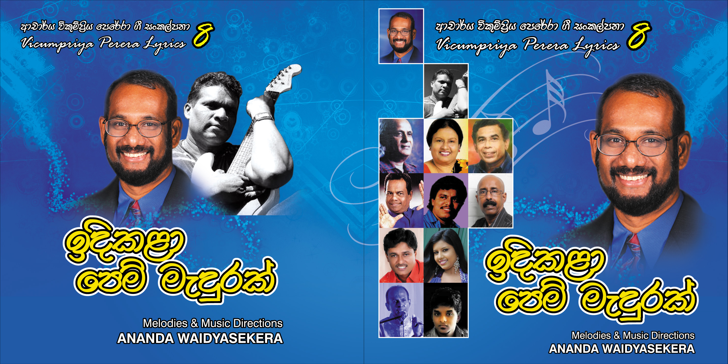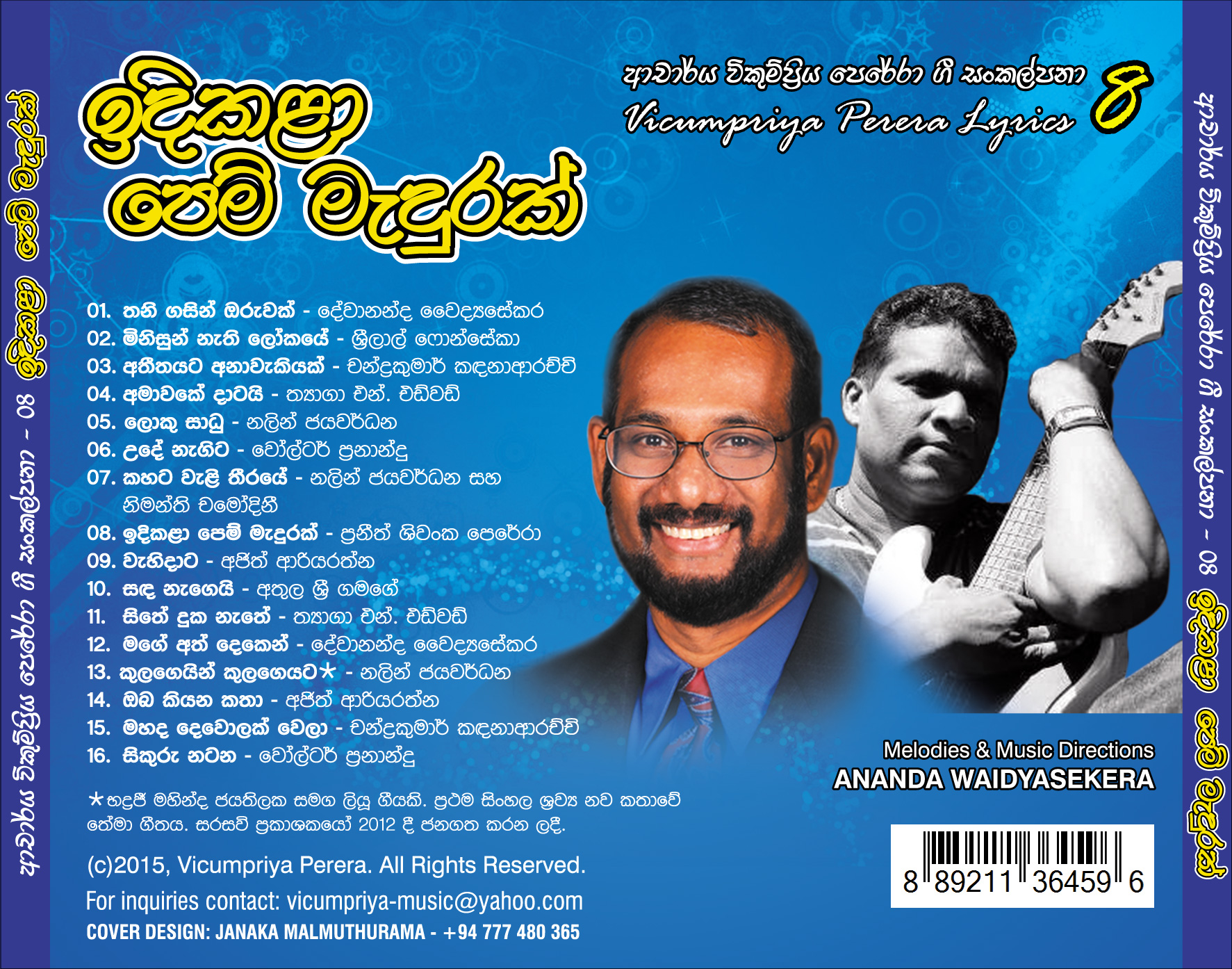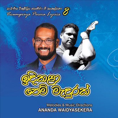 The 8th sinhala lyrical composition album of Vicumpriya Perera with 16 original songs, "Indikalaa Pem Medurak" was released in 2015. All tunes for the songs are composed by Ananda Waidasekera. The album features renowned and popular vocalists Devananda Waidyasekera, Chadrakumar Kandanarachchi, Walter Fernando, Thyaga N Edward, Athula Sri Gamage, Ajith Ariyarathna, Nalin Jayawardena, Nimanthi Chamodini, Srilal Amarajeeva Fonseka and Praneeth Shiwanka Perera. One song featured in the album, "Kulageyin Kulageyata" is written with Bhadraji Mahinda Jayatilaka. CD Cover design by Janaka Malnuthurama. Recorded at the studio of Ananda Waidyasekera, Gampaha, Sri Lanka and the CD production is by Lanka Heritage, LLC.