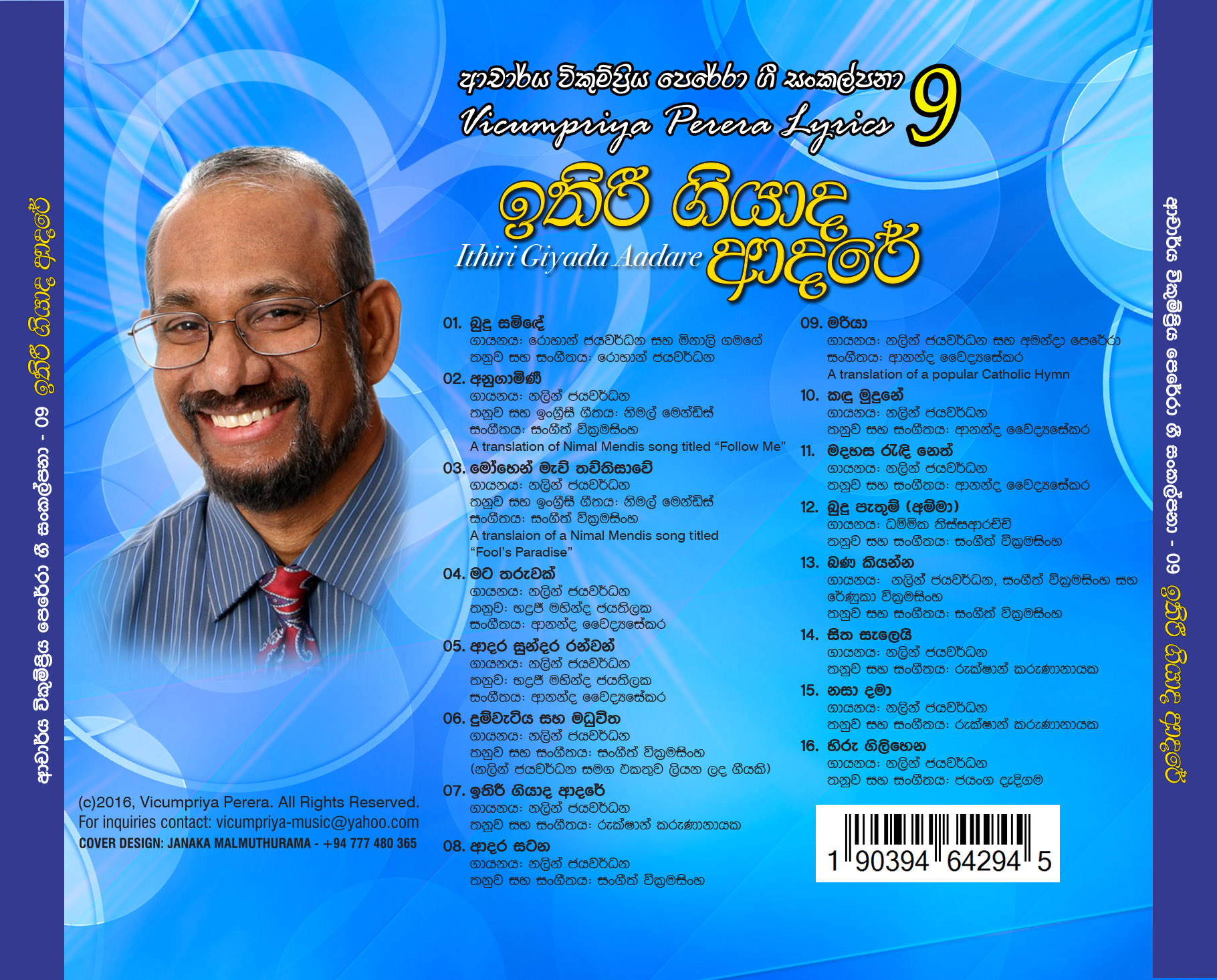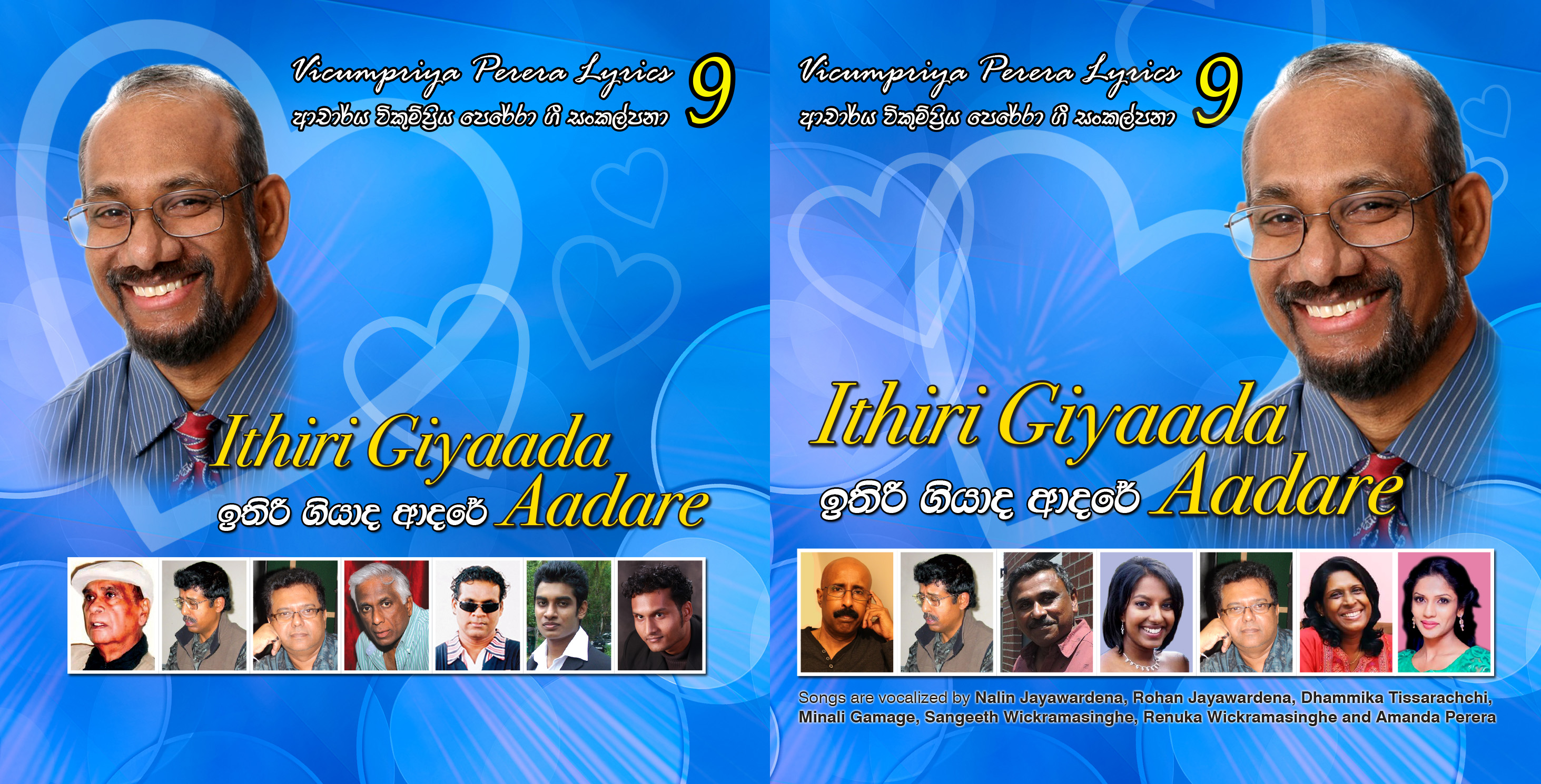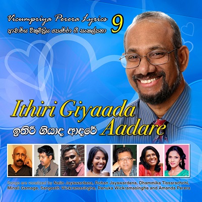 "Ithiri Giyaada Adare" released in 2016 is the 9th album of Sinhalese songs from Sri Lanka written by Vicumpriya Perera. All songs in the album are vocalized by Nalin Jayawardena, except for the two songs that are vocalized by Rohan Jayawardena and Dammika Tissarachchi. Duet singers are Minali Gamage, Amanda Perera, Sangeeth Wickramasinghe & Renuka Wickramasinghe. This CD album contains two songs written by late great music composer Nimal Mendis that had been translated into Sinhala as well as two songs whose tunes were composed by renowned artist Bhadraji Mahinda Jayatilaka. Tune compositions are by Rohan Jayawardena, Nimal Mendis, Bhadraji Mahinda Jayatilaka, Ananda Waidyasekera, Sangeeth Wickramasinghe, Rukshan Karunanayake, and Jayanga Dedigama. Music directed by Ananda Waidyasekera, Sangeeth Wickramasinghe, Rukshan Karunanayake, and Jayanga Dedigama. Cover design by Janaka Malmuturama.