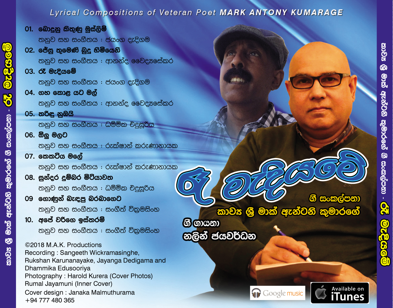 "Rae Mediyame" is a 2018 song release of 10 lyrics by Mark Anthony Kumarage. All songs are vocalized by Nalin Jayawardena. Music direction by Jayanga Dedigama, Ananda Waidyasekera, Dhammika Edussooriya, Rukshan Karunanayake, and Sangeeth Wickramasinghe.