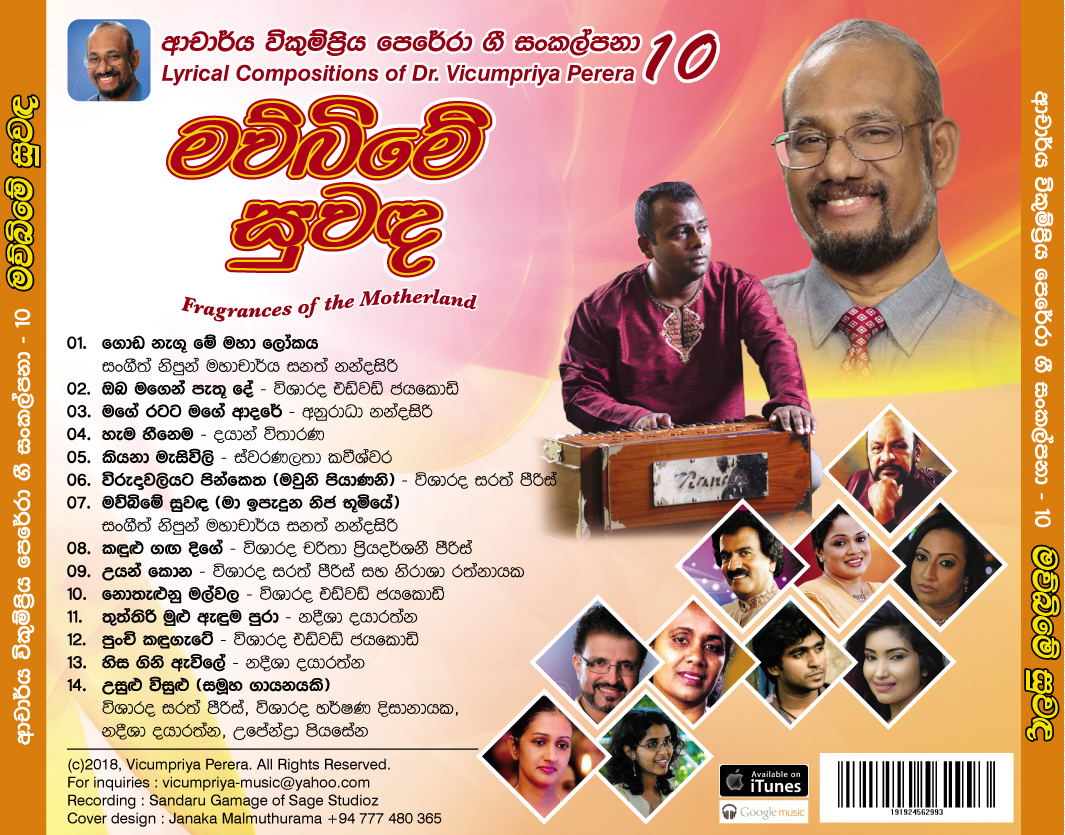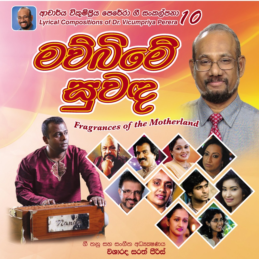 Mawbime Suwandha was the 10th album of Lyrics by Vicumpriya Perera produced in 2018 containing 14 original compositions. The tune composition and music direction for the album is by Visharadha Sarath Peiris. Songs are vocalized by Sangeeth Nipun Professor Sanath Nandasiri, Visharada Edward Jayakody, Anuradha Nandasiri, Dayan Witharana, Swarnalatha Kaveeshwara, Visharada Charitha Priyadarshani Peiris, Visharada Sarath Peiris, Nirasha Ratnayake, Nadeesha Dayaratne, Visharada Harshana Disanayake, and Upendra Piyasena. Songs are recorded by Sandaru Gamage at the Sage Studio, Sri Lanka. Album cover is by Janaka Malmuthurama.