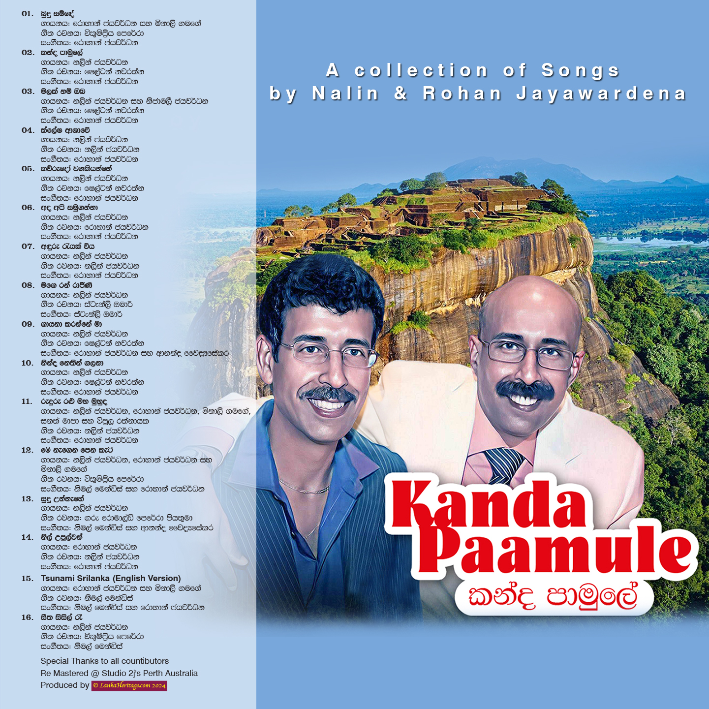 Kandapaamule 2024 is a collection of tracks recorded over years by two brothers Rohan and Nalin Jayawardena who currently reside in Australia. This album contains some songs that were re-recorded and remastered in 2024. The Music direction and composition of all the songs were done by Rohan Jayawardena. He is an accomplished Sri Lankan music director and currently resides in Australia. Vocals are by Nalin and Rohan Jayawardena. Lyrics by Shelton Nawaratne, Nalin Jayawardena, and Dr. Vicumpriya Perera. Duet vocals are by Nijamali Jayawardena, and Minali Gamage. All these songs were recorded (or remastered) in Australia.