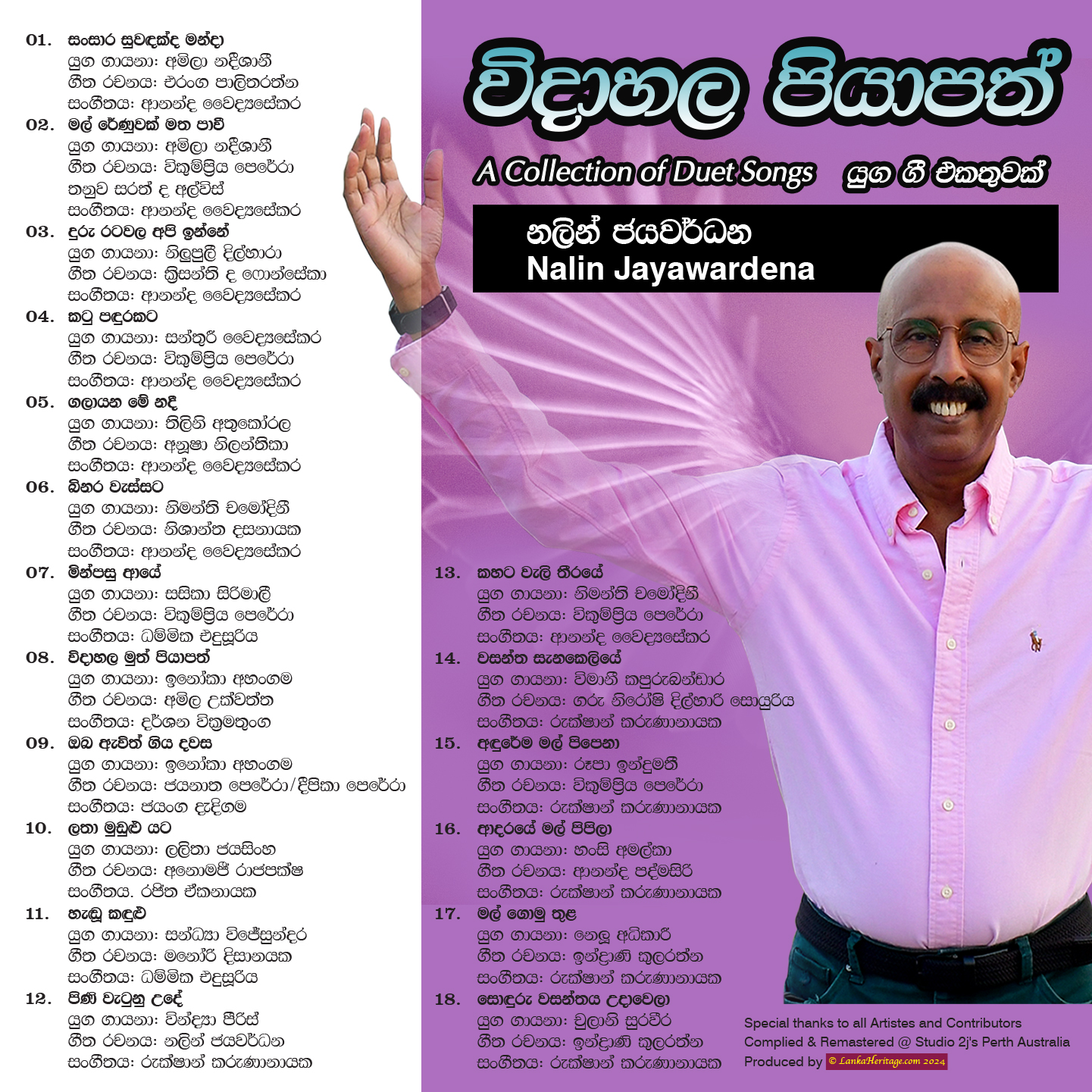 Vidahala Piyaapath contains a collection of 18 duet songs sung by Nalin Jayawardena. Duet singers are Amila Nadeeshani, Nilupuli Dilhara, Santhuri Waidyasekera, Thilini Athukorala, Nimanthi Chamodini, Sasika Sirimali, Inoka Ahangama, Lalitha Jayasinghe, Sandya Wijesundara, Vindya Peiris, Vimani Kapurubandara, Rupa Indumathi, Handi Amalka, Nelu Adikari, and Chulani Suraweera. Lyrics are composed by Eranga Palitharatne, Vicumpriya Perera, Chrishanthi De Fonseka, Anusha Nilanthika, Nishantha Dasanayake, Amila Ukwatta, Jayanatha Perera, Deepika Perera, Manori Disanayake, Nalin Jayawardena, Sr. Niroshi Dilhari, Ananda Padmasiri, and Indrani Kularatne. The Music direction and composition were done by Ananda Waidyasekera, Sarath de Alwis, Dammika Edussoriya, Jayanga Dedigama, Rajitha Ekanayake, Rukshan Karunanayake, and Darshana Wickramathunga. All these songs were recorded (or remastered) in Australia.