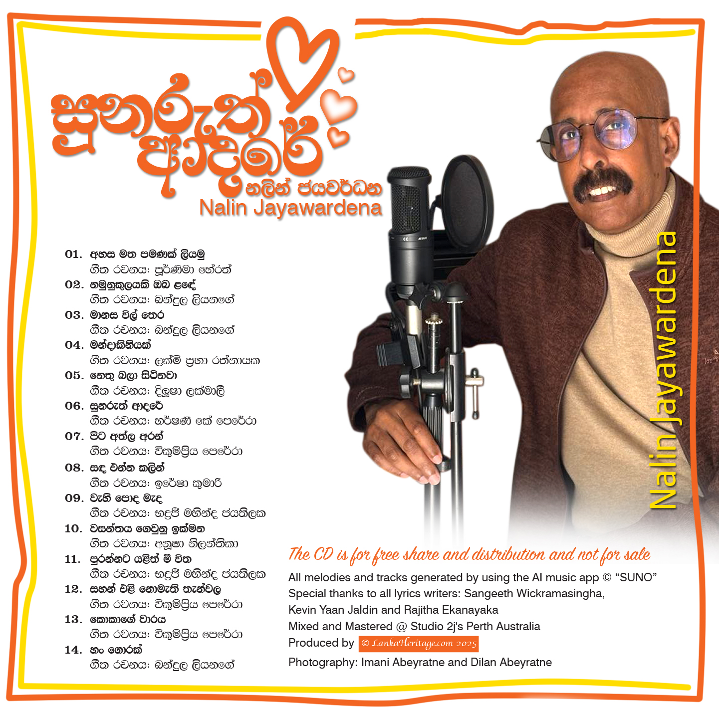 Sunaruth Adare is an ablum containing 14 original songs. It is an experimental album, human voice interacted with AI made music and is not for sale. All melodies and music tracks were generated through the AI app SUNO and are copyrighted to the platform provider. Original lyrical compositions for this album is done by Purnima Herath, Bandula Liyanage, Lakmi Praba Ratnayake, Dilusha Lakmali, Harshani K Perera, Iresha Kumari, Bhadraji Mahinda Jayatilaka, Anusha Nilanthika, and Vicumpriya Perera. Our special thank you to Sangeeth Wickramasinghe, Rajitha Ekanayake, and Kevin Yann Jaldin.